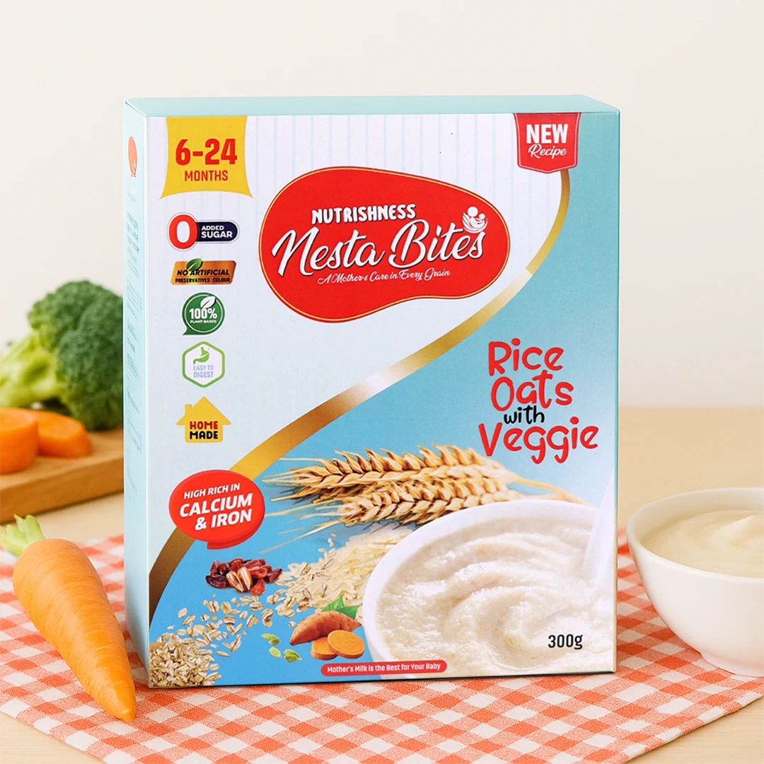 At Nutrishness, we understand the challenge of introducing vegetables. Our Rice Oats with Veggie mix makes it easy! This blend combines soft, easily digestible Rice and high-fiber Oats with the natural nutrients of real vegetables (like Sweet Potato, as pictured) to create a mild, savory flavor your baby will love.