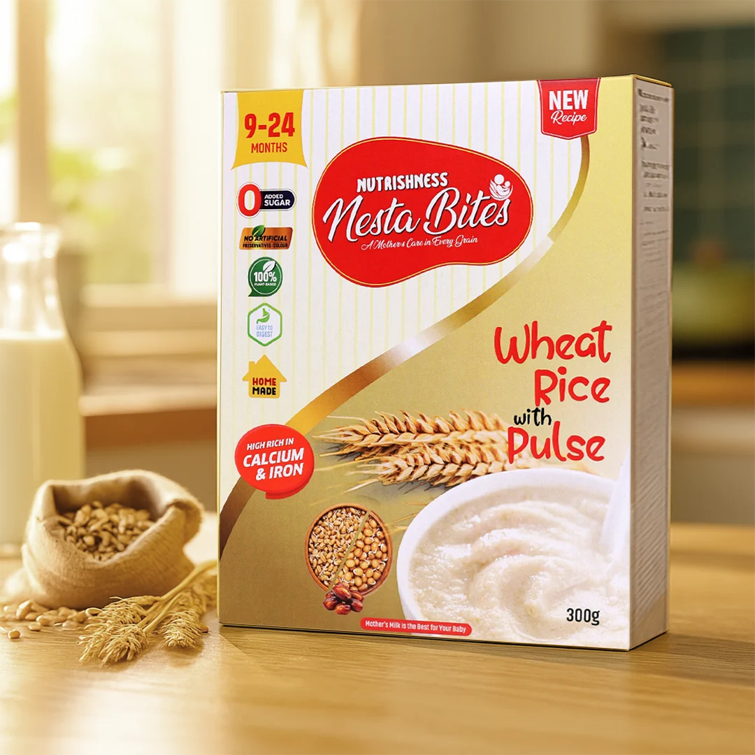 For balanced growth and hearty nutrition, try Nesta Bites Wheat Rice with Pulse. Designed for babies 9 to 24 Months, this savory mix combines the goodness of Wheat and Rice with nourishing Pulse (Dal/Lentil). It provides a complete protein source, high in fiber, and is formulated to be easily digestible for your active toddler.